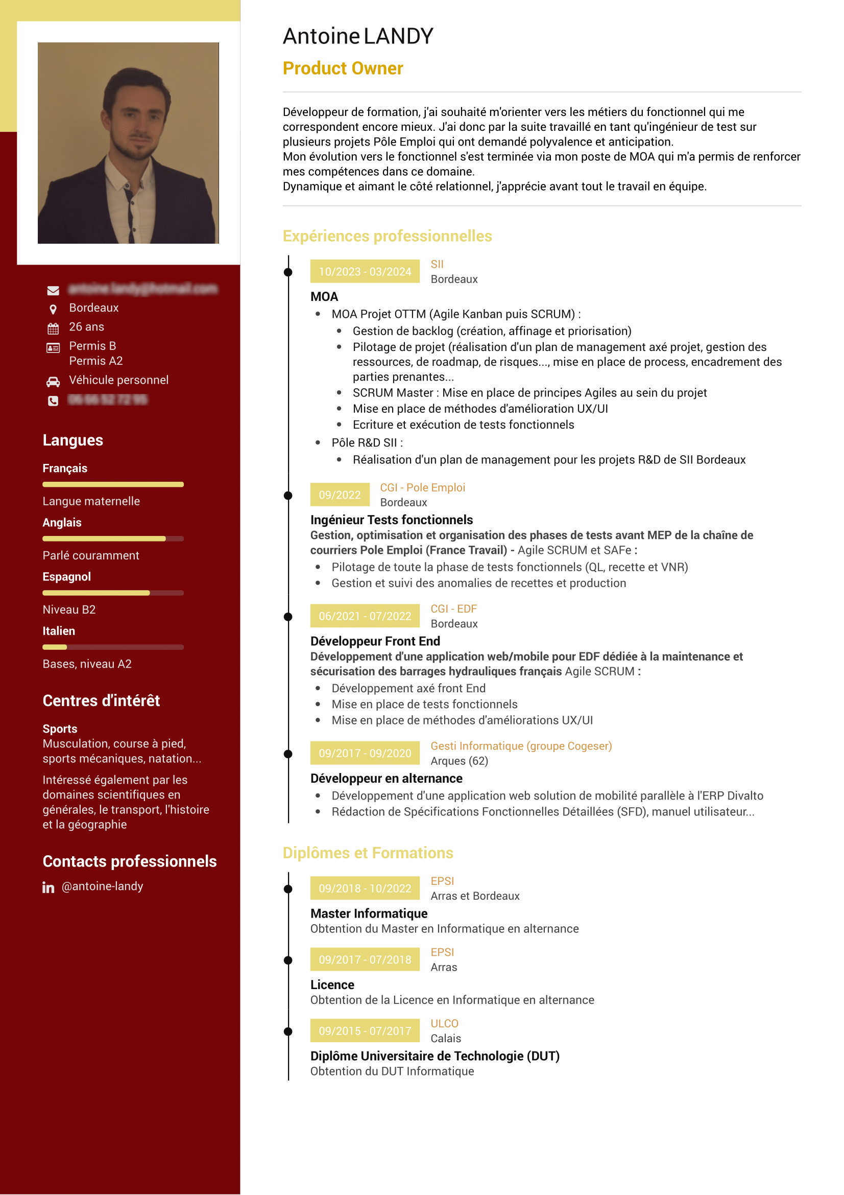 Langues : Français LANQUE MATERNELLE Anglais A1A2 B1B2 C1C2 Espagnol A1A2 B1B2 C1C2 Italien A1A2 B1B2 C1C2